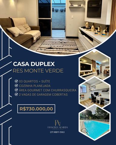 ✨ Casa Duplex 3 Quartos com Suíte | 107m² | Reformada | 2 Vagas – Residencial Monte Verde 📍 Morada de Laranjeiras | Serra 💰 R$ 730.000,00 Se você busca conforto, modernidade e um imóvel pronto para morar, essa casa é a escolha perfeita! Com 107,31 m² de área total (68,51 m² de área construída + 38,80 m² de jardim/quintal), essa belíssima casa duplex foi totalmente reformada, oferecendo ambientes sofisticados, funcionais e climatizados. ✨ Destaques do imóvel: ✔ 3 quartos, sendo 1 suíte ✔ Sala ampla para dois ambientes ✔Cozinha com armários planejados ✔ Planejados em todos os ambientes ✔ Ambientes climatizados ✔ Área gourmet com churrasqueira ✔ Telhado retrátil na área externa com lavanderia ✔ Vista livre ✔ 2 vagas de garagem cobertas A área externa é perfeita para receber amigos e familiares, proporcionando momentos especiais com conforto e privacidade. 🌿 Estrutura do condomínio: O Residencial Monte Verde oferece lazer completo e segurança: 🏊 Piscina 🏀 Quadra poliesportiva 🔥 Churrasqueira 🎉 Salão de festas 🛡 Portaria 24 horas 🌳 Ruas arborizadas e ambiente tranquilo 📆 Agende sua visita e venha conhecer de perto cada detalhe!